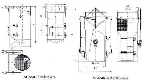 木块分离器是制粉系统中的重要部件之一,由于电厂来煤不是很纯,进入磨煤机的原煤往往夹带有木块、麻袋、稻草等杂物,在磨煤机内不易被粉碎,通过磨煤机后,往往堵在粗分离器回粉管道里或制粉管道拐弯处,严重影响制粉系统的正常运行,为了提高制粉系统运行的经济性和安全性,需要在磨煤机出口加装木块分离器。 木块分离器分为手动和电动两种型式。 SC-SMK系列手动木块分离器共有八个规格,SC-DMK系列电动木块分离器有五种规格,都是较为成熟的定型产品
