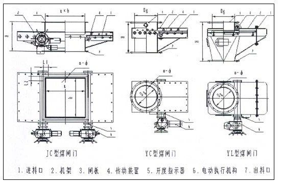 一、概述 DMZ系列电动煤闸门是我公司根据国内电厂提高自动控制水平,减轻劳动强度和安全生产的需要,借鉴国外先进技术和国内电力行业实际情况相结合而设计制造的新型煤斗闸门。DMZ系列煤闸门适合安装于电厂原煤斗下部,根据磨煤机的工作情况,开启或关闭原煤斗,使原来繁重的开启、关闭原煤斗工作实现机械化操作。该设备既能进行现场操作,也可由中心控制室控制;设备外壳上装设了闸板开度指示器,既可随时知道闸门的位置,又可借助于本设备起到控制流量的作用。并且运行灵活、安全可靠,极大地减轻了工作人员的劳动强度,并减少了关闭前的准备时间。是各发电厂技术改造和设备更新的理想产品。 二、 结构及原理 SC-DMZ系列电动煤闸门主要由进料口、出料口、机架、闸板开度指示器、传动机构、闸门、电动执行机构和电控箱等几部分组成。 原煤由进料口上部垂直进入,通过闸门的开启,从出料口下部流出,进入后续设备。通过控制闸板的开启大小,可达到控制其流量。其中机架是安装所有零部件的基础部件,电动执行机构通过传动机构控制闸门的启闭,闸板开度指示器与主轴连动随时指示闸板门的位置。进出料口可根据用户需要做成矩形(J)或圆形(Y),闸门有又开和单开两种形式,闸门通过水平运动完成开启和关闭动作。电动执行机构和传动机构是整台设备的关键部件,本公司选用质量可靠、性能优异的配套部件,保证整台设备操作灵活方便,安全可靠。 三、 型号说明